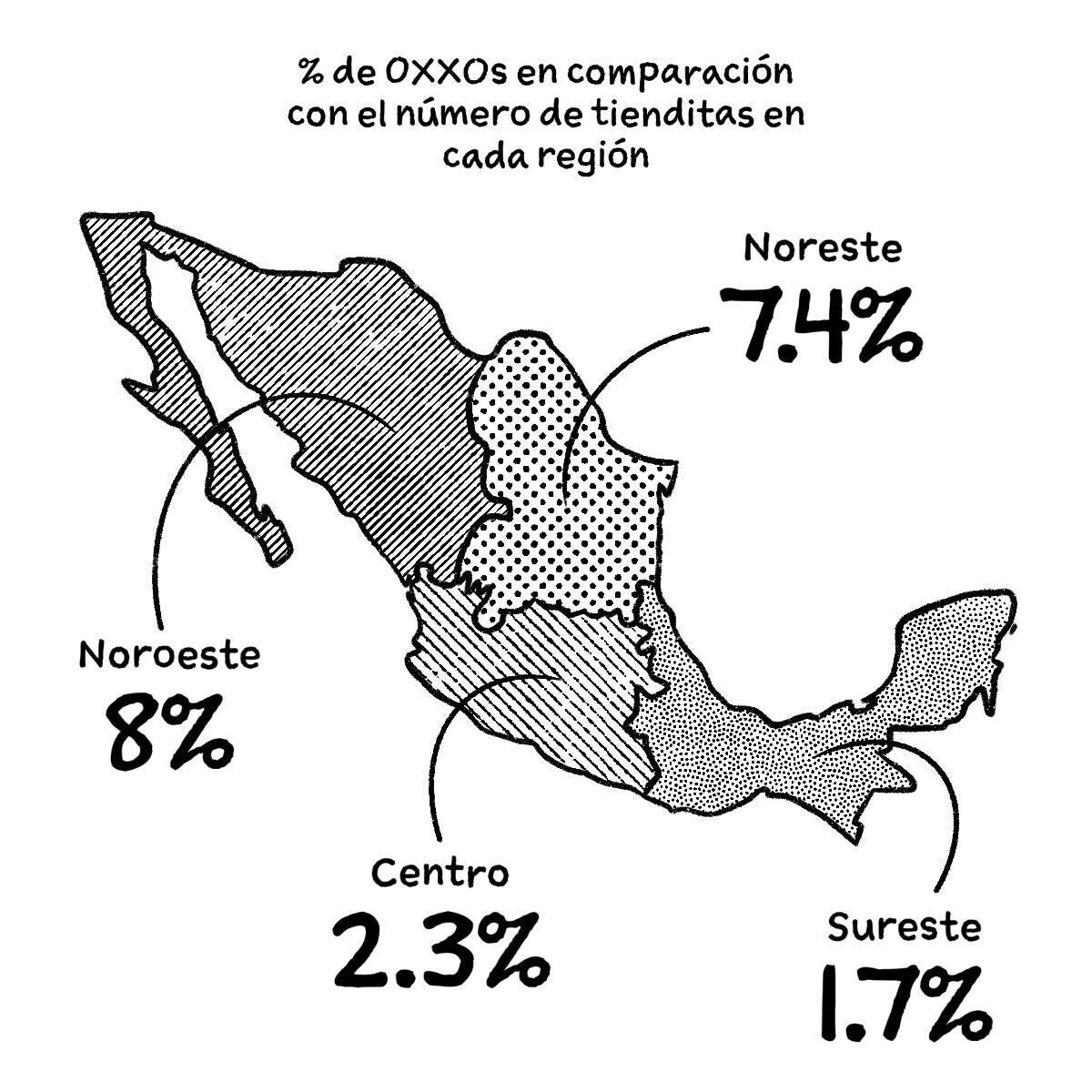 Hace 20 años, por cada 1,000 tienditas había cerca de seis OXXOs, pero para 2020, este número se multiplicó más de cinco veces: ahora habría alrededor de 32 sucursales de OXXO por cada 1,000 tienditas. Evidentemente, no es que haya menos comercios de este tipo, sino que OXXO crece de una forma descomunal (que también sobresale en su proporción en comparación con otras cadenas de conveniencia)