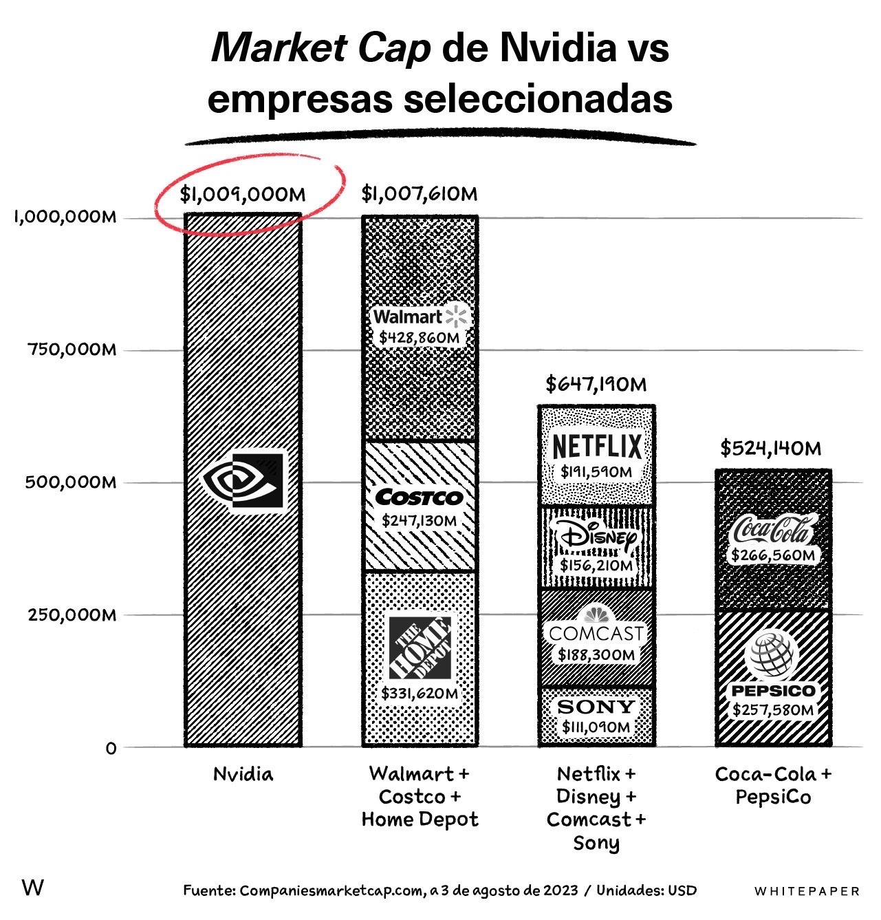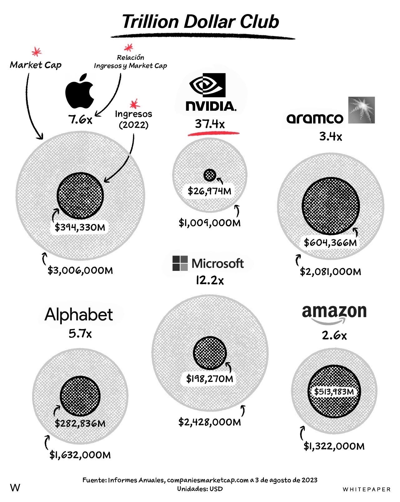 Este año Nvidia entró al Trillion Dollar Club, ya que junto con Apple, Microsoft, Saudi Aramco, Alphabet y Amazon alcanzó un market cap por encima del trillón de dólares (en el sentido americano).