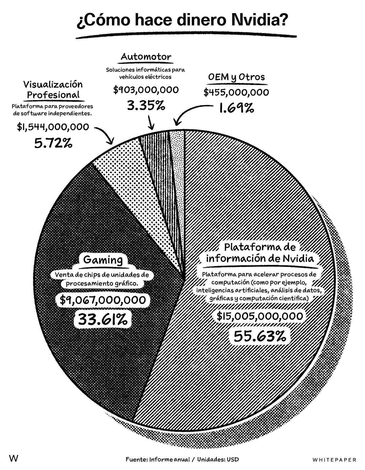 Comentario Whitepaper: Nvidia es la empresa más importante de GPUs (unidades de procesamiento gráfico) a nivel global. Además de procesar gráficos para programas de edición de vídeo y videojuegos, son esenciales para plataformas de inteligencia artificial generativa, como ChatGPT de la empresa Open AI.
