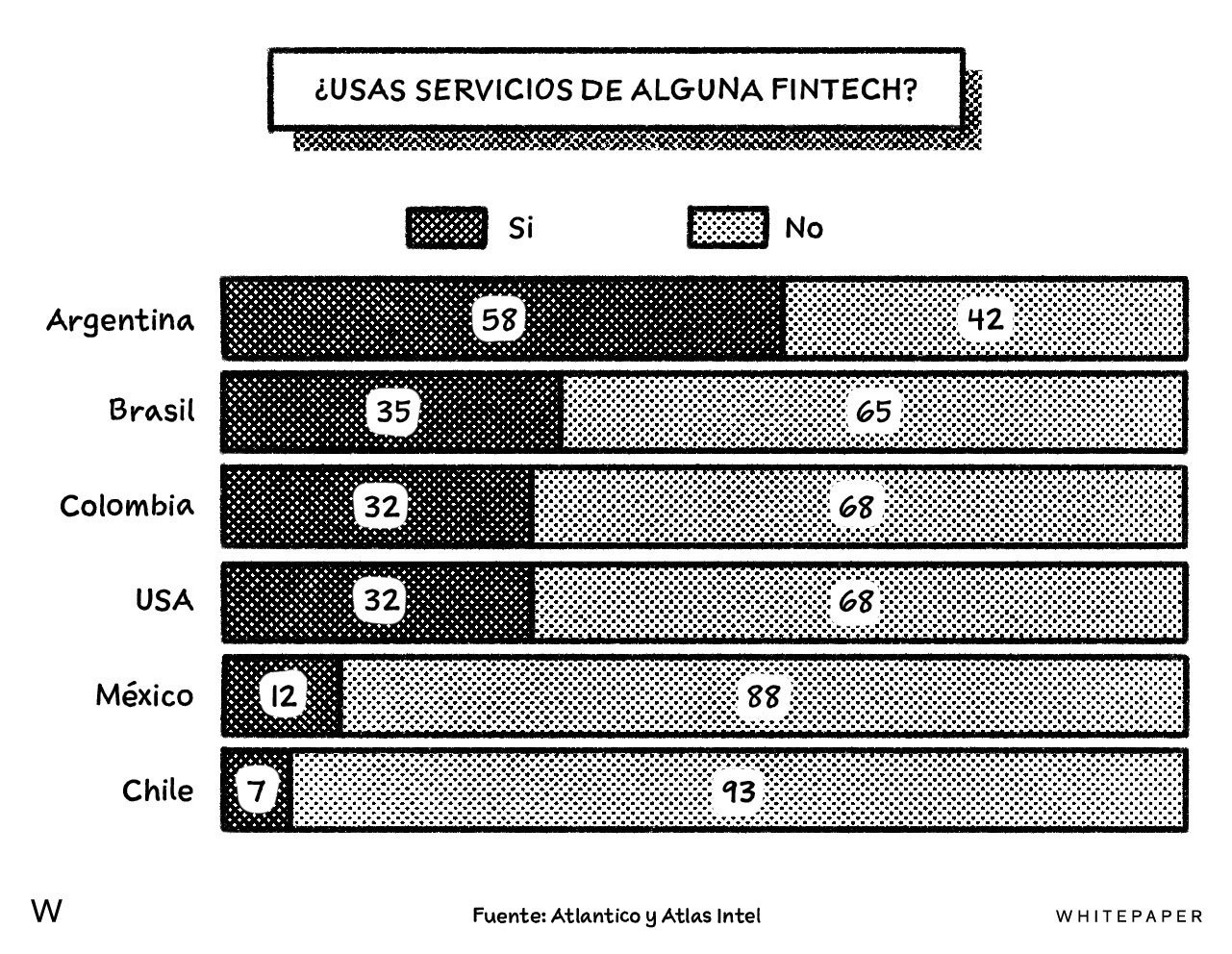 La última versión del Latin American Digital Report, de Atlantico (el fondo brasileño de venture capital) encontró que en México apenas el 12% de la población reporta haber utilizado los servicios de alguna de las fintech. Por otro lado, solamente el 38% respondió estar insatisfecho con la posibilidad de tener acceso a crédito, así sea para temas personales o de negocio — una cifra muy diferente al nivel de insatisfacción en Brasil (64%) o Chile (73%).